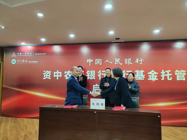 启动仪式上,人行内江市中心支行与资中农商银行现场签订了发行基金托管协议,并授予“中国人民银行资中农商银行发行基金托管库”牌匾。