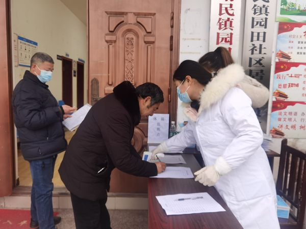 靖民镇园田社区党员进入选举会场签到,并进行体温监测、查验健康码(内江经开区供图)