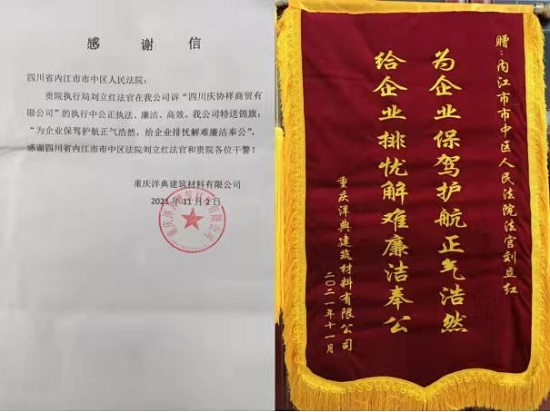 四川新闻网消息(陈颖)11月5日,市中区法院经开区人民法庭执行工作组法官收到了申请执行人重庆洋典建筑材料有限公司邮寄来的写有“为企业保驾护航正气浩然,给企业排忧解难廉洁奉公”的锦旗和一封感谢信。