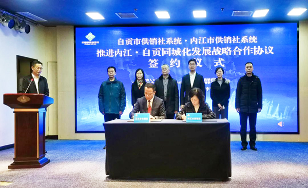 张建萍表示,内江与自贡山水相连、人文相近、民俗相通,有着互补共融的现实需求和广阔空间,今年10月,省上出台了《内江自贡同城化发展总体方案》。此次合作,两地供销社要秉持“内自一家亲、供销一家人”理念,抢抓机遇,打破行政区划界限,整合区位、资源、产业等优势,深入开展交流合作,实现资源互补、利益共享,不断增强供销社活力和可持续发展能力。
