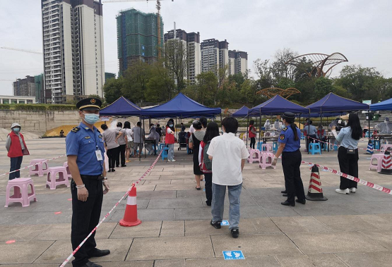 31日上午7时许,辖区内的长安社区、高桥社区、三湾社区、新立社区、蟠龙社区、碑山社区的核酸检测点,内江高新区综合行政执法局的执法人员已在现场维持秩序。