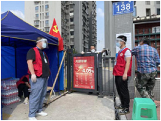 高哲和刘勰宇同志在圣江社区贤山家园卡点值班值守 |