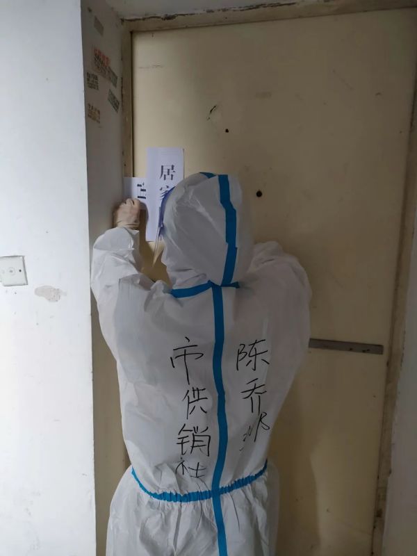 ▲陈乔娜正在张贴居家隔离封条