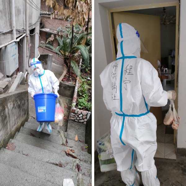▲程宁正在为居民配送生活物资