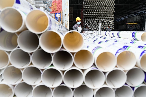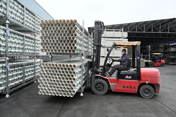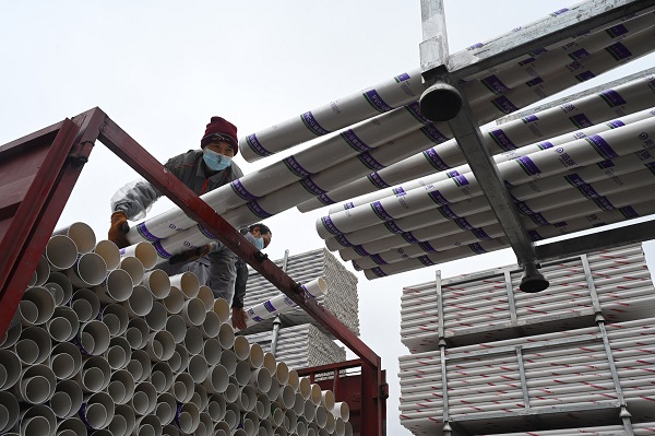 四川新闻网消息 2022年11月30日,在位于四川省内江东兴经济开发区的四川鸿宇恒创塑料制品有限责任公司内,工人在装运高分子聚氯乙烯管材。