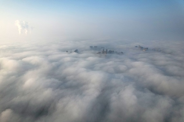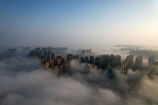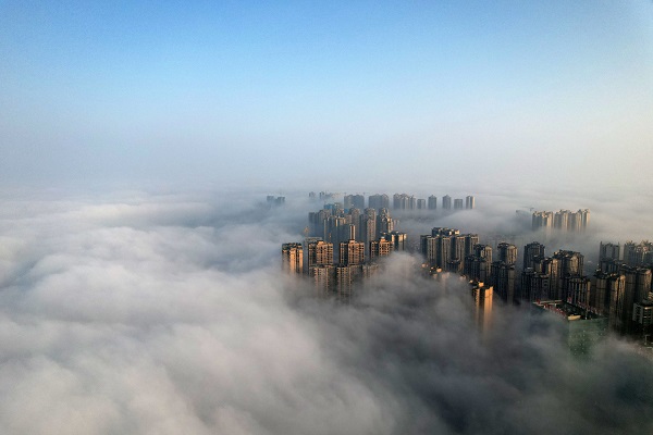 2022年12月5日,素有“甜城”美誉的四川省内江市东兴区出现大雾天气,城市楼宇在云雾中若隐若现,宛如仙境,美如画卷。(