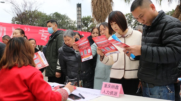 工作岗位送到了家门口,白马镇居民廖晓英很高兴。她围在一家家政公司的招聘摊位前,向工作人员咨询岗位信息。