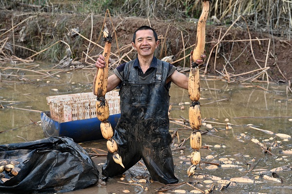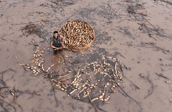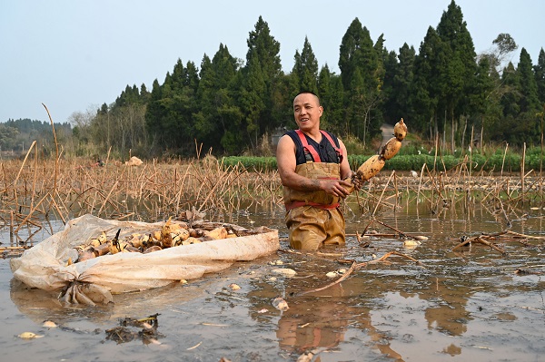 春暖花开时节,四川省内江市东兴区永福镇鸦鹊寺村春藕大面积成熟,当地村民及时采挖上市,期待有个好收成。(供稿:内江市东兴区委宣传部 李建明/摄)