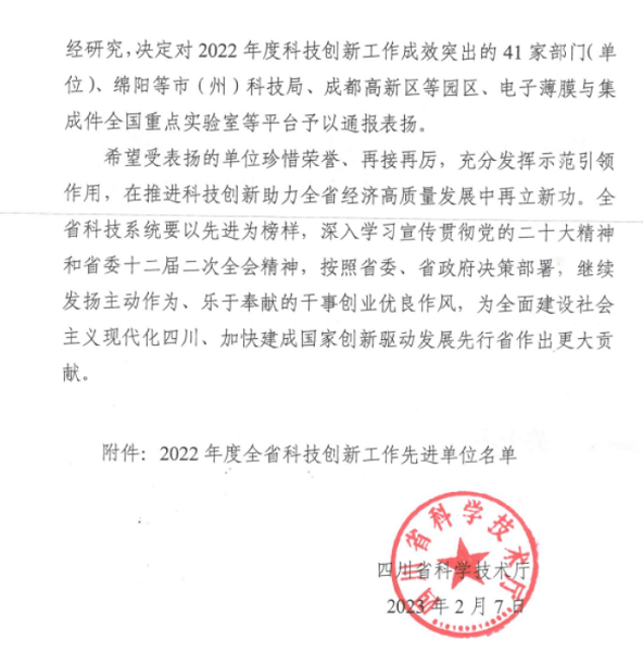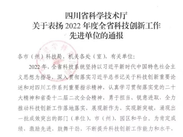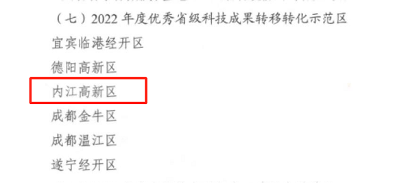 四川新闻网消息(李永琴)日前,四川省科学技术厅印发《关于表扬2022年度全省科技创新工作先进单位的通报》,内江高新区荣获2022年度优秀省级科技成果转移转化示范区。名单如下: