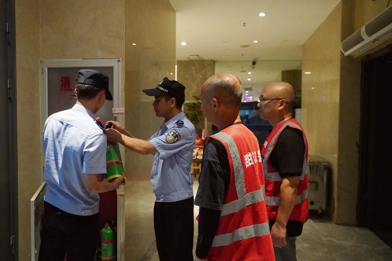▲治安巡逻队员在检查消防设施
