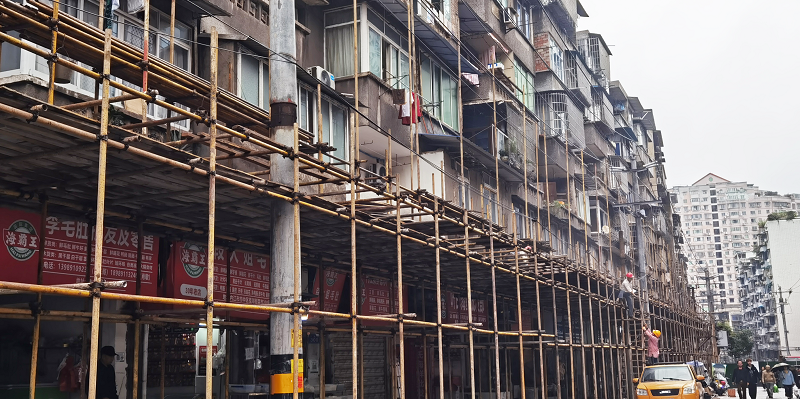 与此同时,在桂湖街八小区楼栋外,数名工人正在紧张有序地进行外墙钢管架搭建作业,为楼栋外立面喷真石漆做准备。