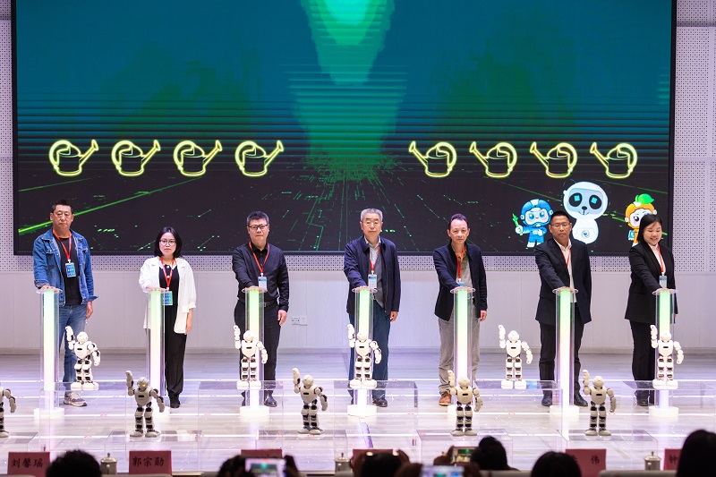 随着倒计时的宣布和主会场数字吉祥物“憨憨”的到场祝福,7位领导嘉宾伸出手掌合力将灯光启动柱闪耀亮起,让科学之树发芽长大,分赛场活动正式启动,在全场的欢呼声中,一幼城南园进入彻底的科技狂欢。
