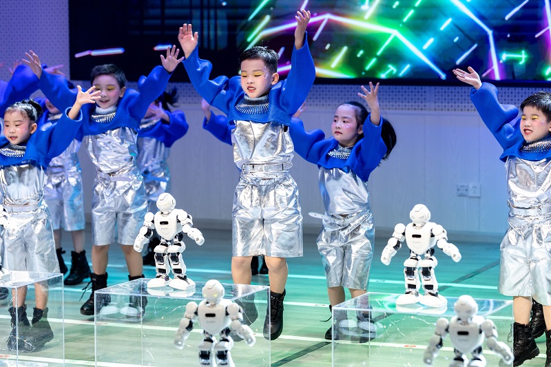 活动中,内江一幼师幼代表还给观众们带来一场精彩的人机共舞《科技筑梦,点亮童心》,节目中小朋友与小小机器人热情互动,场面科技感与童趣性并存,十分热闹。幼儿科技教育一直以来也是内江一幼的办园亮点之一,幼儿园将科学乐创融入园文化内涵,积极打造VR体验室、光影游戏室及机器人搭建室等多种科创功能室,多次组织师幼参加四川省青少年“亲子创意搭建”项目荣获奖项,并在2023年被四川省青少年科技教育协会遴选为首批“四川省青少年科技教育创新实验学校”,同年成功创建“内江市智慧教育学校”。