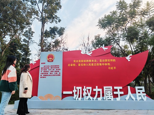 融法于景,创优普法内容。通过”宪法宣誓墙”“法治宣传栏”等多样形式,将《中华人民共和国宪法》《中华人民共和国民法典》以及内江地方法规等与居民生活密切相关的法律知识与公园绿化、设施有机融合,形成了集休闲娱乐学习于一体的户外法治文化学习园地。居民在享受公园风光的同时,还能随处观赏法律文化景观,学习法律知识,树立法治观念,更好满足人民群众的法治文化需求,使普法宣传更接地气。