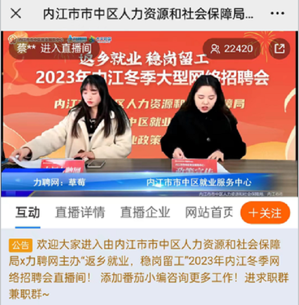 四川新闻网消息 为有效促进外出务工返乡人员、高校毕业生等重点群体返乡就业,扎实做好就业创业服务工作,12月18日,内江市市中区就业服务中心与内江力聘网合作,携手走进网络招聘会直播间,开展“直播讲政策 服务零距离”线上就业创业促进活动。