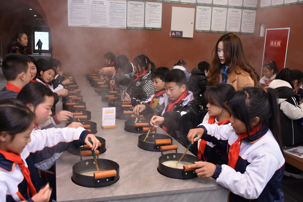 ▲12月21日下午,在内江市市中区龙门镇汉安糖草博物馆,田家镇中心校学生手工体验古法红糖非遗传承。