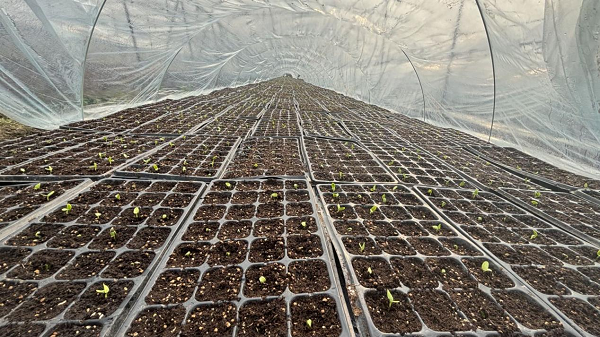 眼下,正是蔬菜育苗的好时节,近日,在内江市市中区永安镇下元村温室大棚里,工作人员正忙着漂盘、搬运穴盘、装基质土、浇水、点种等,各个环节有条不紊地进行着。一盘盘育苗盘整齐排列,只待种子破土而出。而另一边的早熟黄瓜苗已茁壮出苗,绿意盎然、长势喜人,为新一年的农业生产播下了新的丰收希望。