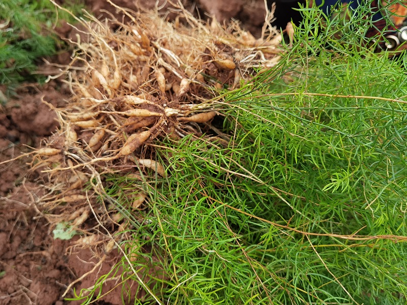 ▲村民们正在基地里忙着采挖天冬苗